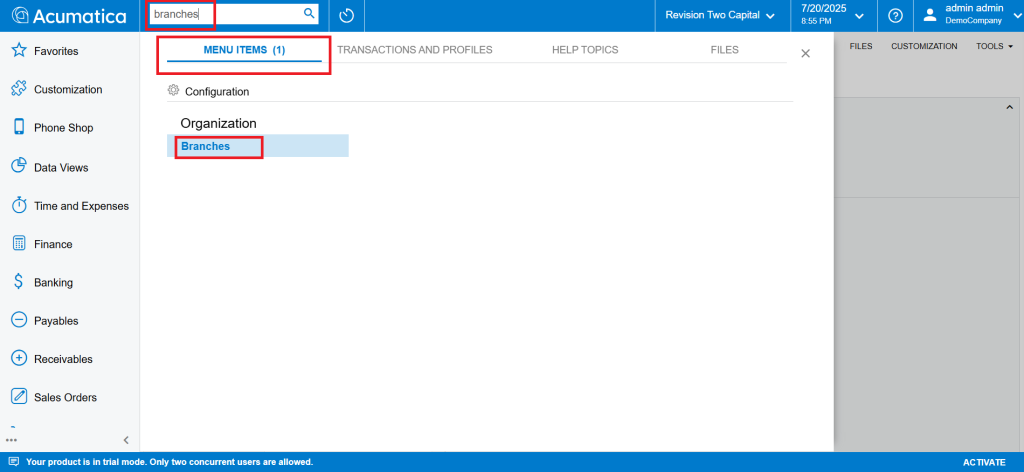 Start by typing the keyword “Braches” in Acumatica Universal search.
