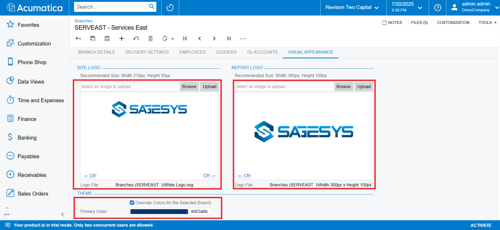 Once you have selected the branch, navigate to the “Visual Appearance” tab. This tab contains settings related to the branding in Acumatica ERP.